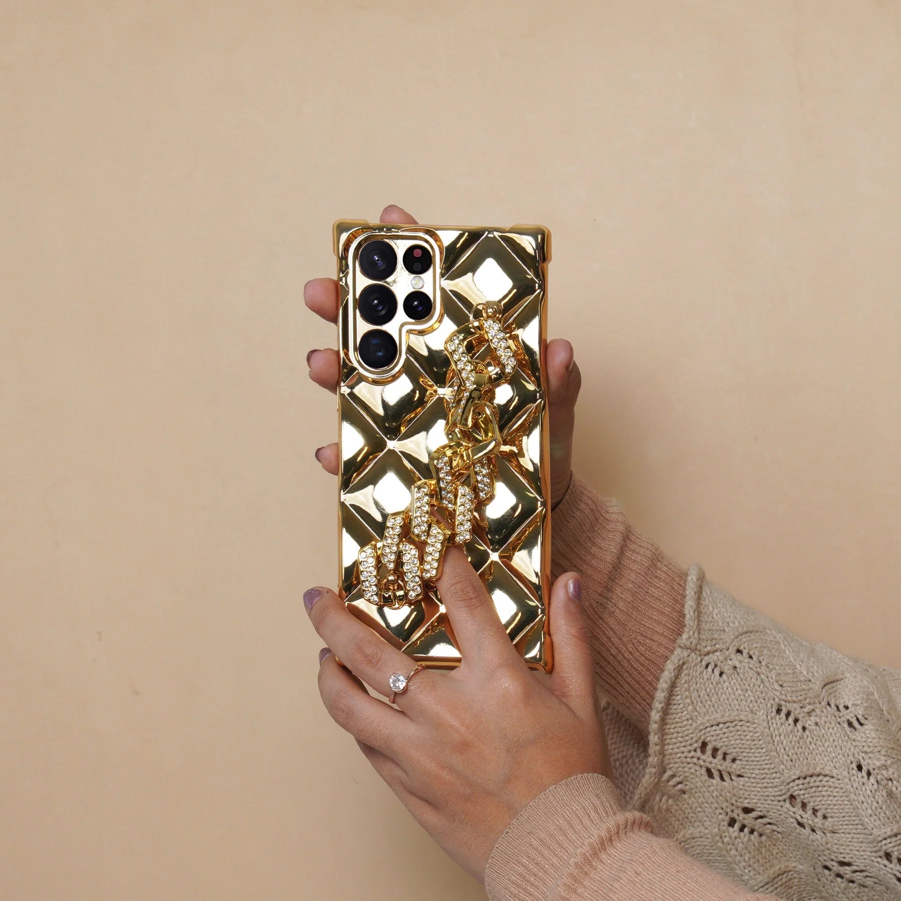 A 3D Rhombus Pattern Rhinestone Chain phone case is a protective phone case designed to fit a variety of phone models, such as iPhones or Samsung Galaxy phones. The case is typically made of a durable material like polycarbonate or silicone, and it features a unique 3D rhombus pattern with rhinestones and a chain attached to it.