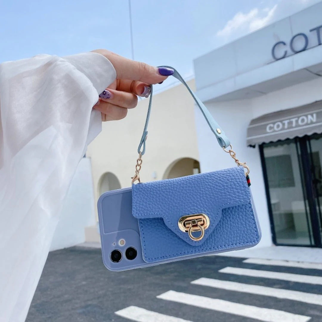 Introducing the brand new wrist strap case with a leather wallet. An amazing case to carry and display your phone in style. The case is designed precisely to make sure all the ports are easily accessible. The leather wallet can be used to keep stuff like money, cards, and a charging cable. Get one today and flaunt it in style.
